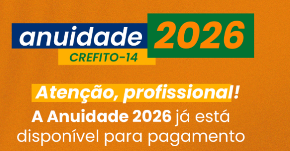 Já é possível realizar o pagamento da anuidade 2026. O acesso para pagamento é feito exclusivamente no Portal do Profissional no site crefito14.org.br .