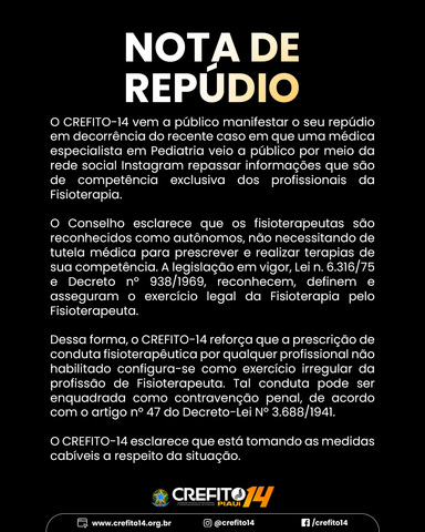 O CREFITO-14 vem a público manifestar o seu repúdio em decorrência do recente caso em que uma médica especialista em Pediatria veio a público por meio da rede social Instagram repassar informações que são de competência exclusiva dos profissionais da Fisioterapia.