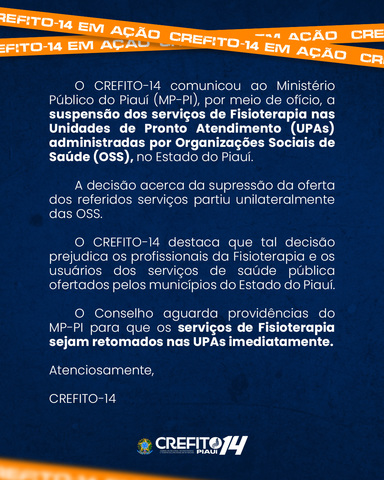 CREFITO-14 comunica MP-PI sobre supressão de serviços de Fisioterapia nas UPAs
