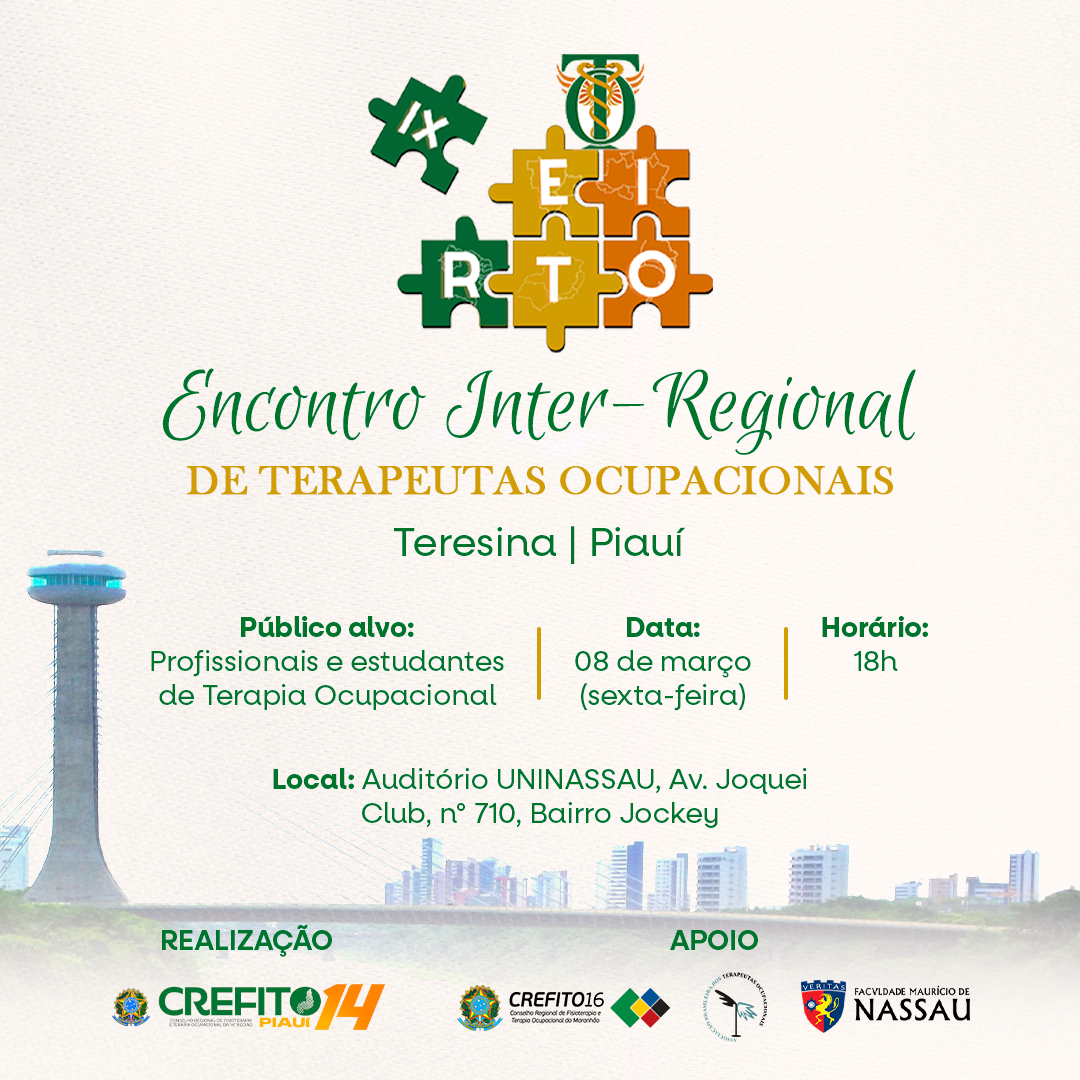 No dia 8 de março irá acontecer a abertura do IX Encontro Inter-Regional de Terapeutas Ocupacionais, em Teresina (PI). A programação do evento irá contar com a presença de representantes da Associação Brasileira de Terapia Ocupacional (ABRATO) e da Rede de Ensino e Pesquisa em Terapia Ocupacional (RENETO).