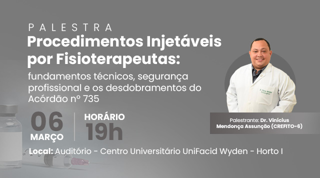 O CREFITO-14 promoverá uma palestra com o tema “Procedimentos Injetáveis por Fisioterapeutas: fundamentos técnicos, segurança profissional e os desdobramentos do Acórdão nº 735”. A atualização será ministrada pelo fisioterapeuta Dr. Vinícius Mendonça Assunção, diretor-secretário do COFFITO.