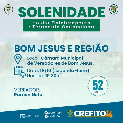 Na segunda-feira, 18, o Presidente do CREFITO-14, Dr Rodrigo Amorim, estará no município de Bom Jesus - PI, representando o Conselho Regional de Fisioterapia e Terapia Ocupacional da 14ª Região (Piauí) no ato de solenidade em Homenagem ao mês do Fisioterapeuta e do Terapeuta Ocupacional. Evento proposto pelo Vereador, Ramon Neto, a partir das 19h30, na Câmara de Vereadores do município.