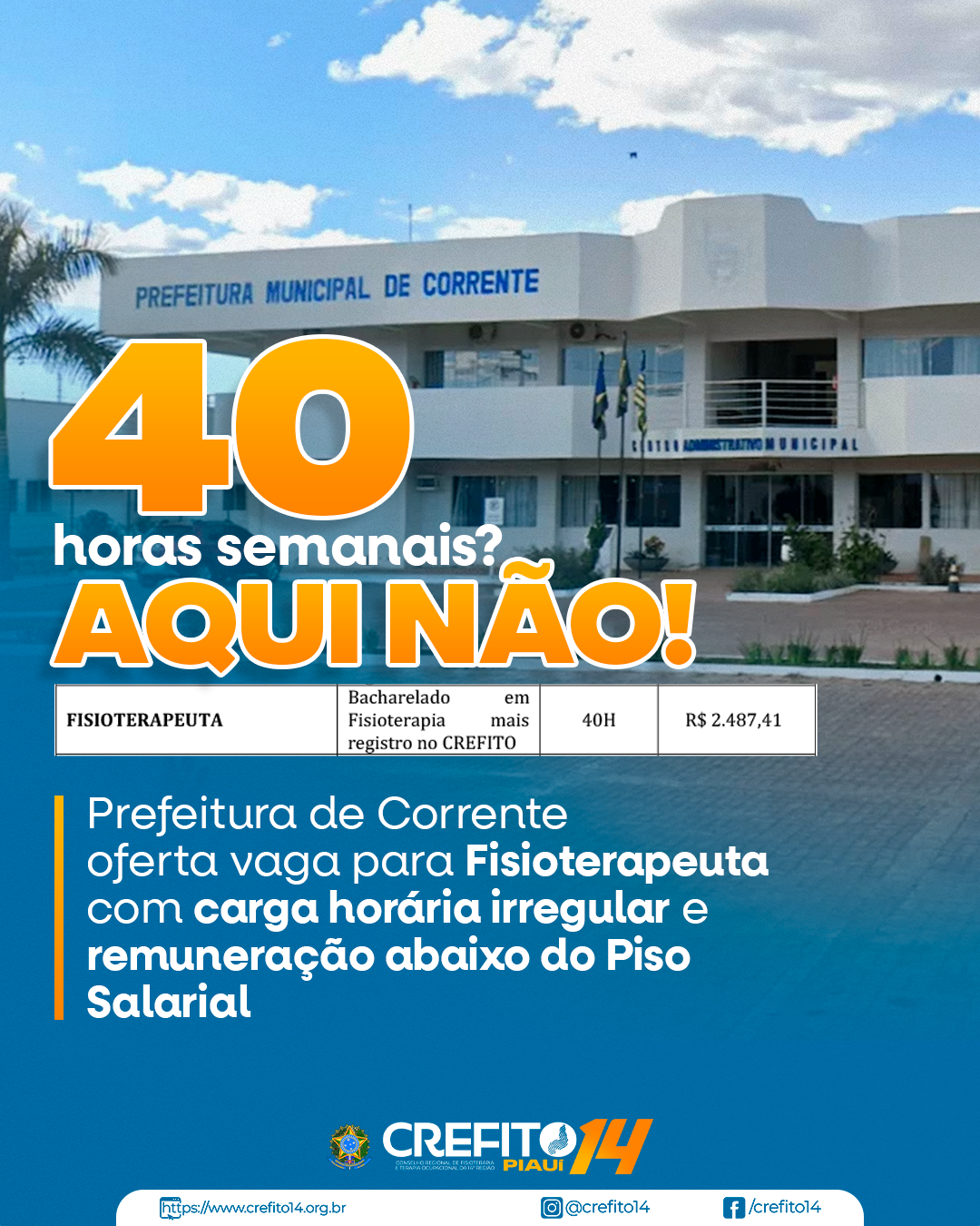 Não iremos aceitar as condições desrespeitosas expostas no Edital do Concurso Público do município de Corrente (PI), este, que desvaloriza o Fisioterapeuta ao ofertar uma vaga com carga horária de 40h semanais e remuneração de R$ 2.487,41, extremamente abaixo do Piso Salarial determinado pela Lei Estadual n.º 7.914/2022!