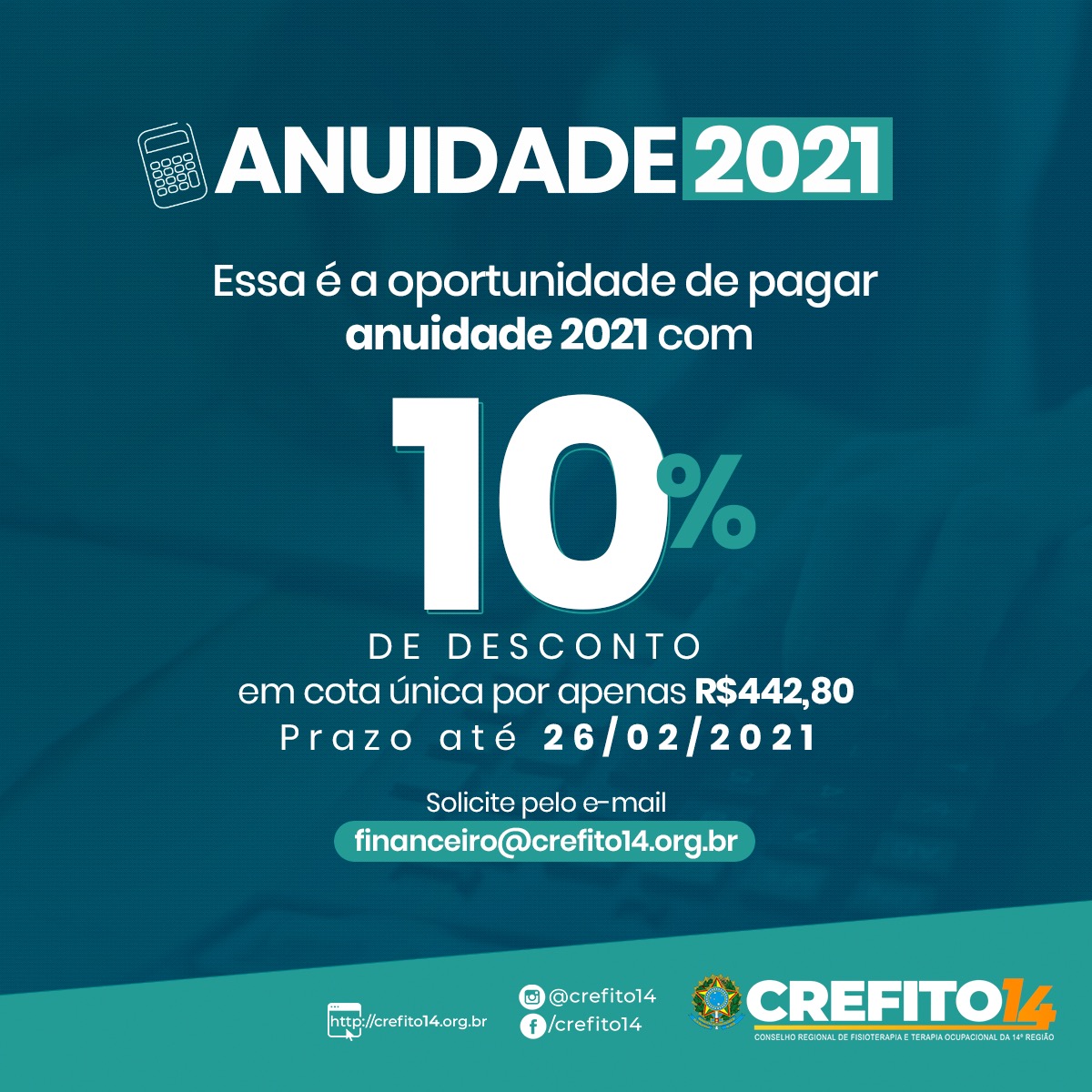 Aos profissionais que já possuem a carteira profissional, realizando o pagamento ANUIDADE 2021, até 26/02/2021, recebe desconto de 10% em boleto cota única, pagando o valor total de R $442,80.