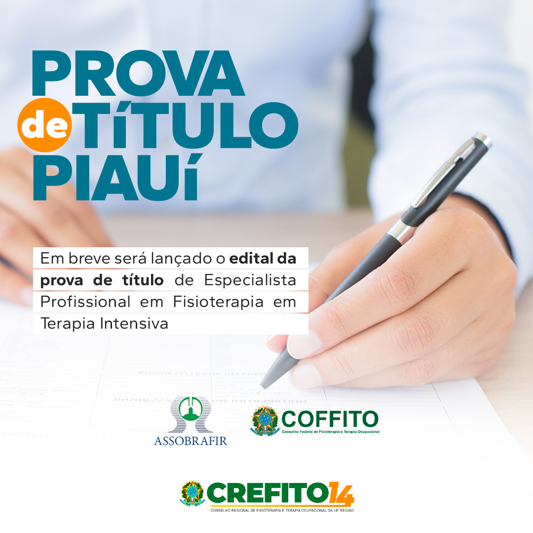 O CREFITO-14 informa que em breve será lançado o edital da prova de título de Especialista Profissional em Fisioterapia em Terapia Intensiva. A Associação Brasileira de Fisioterapia Respiratória, Fisioterapia Cardiovascular e Fisioterapia em Terapia Intensiva (ASSOBRAFIR) é parceira do COFFITO nessa realização.