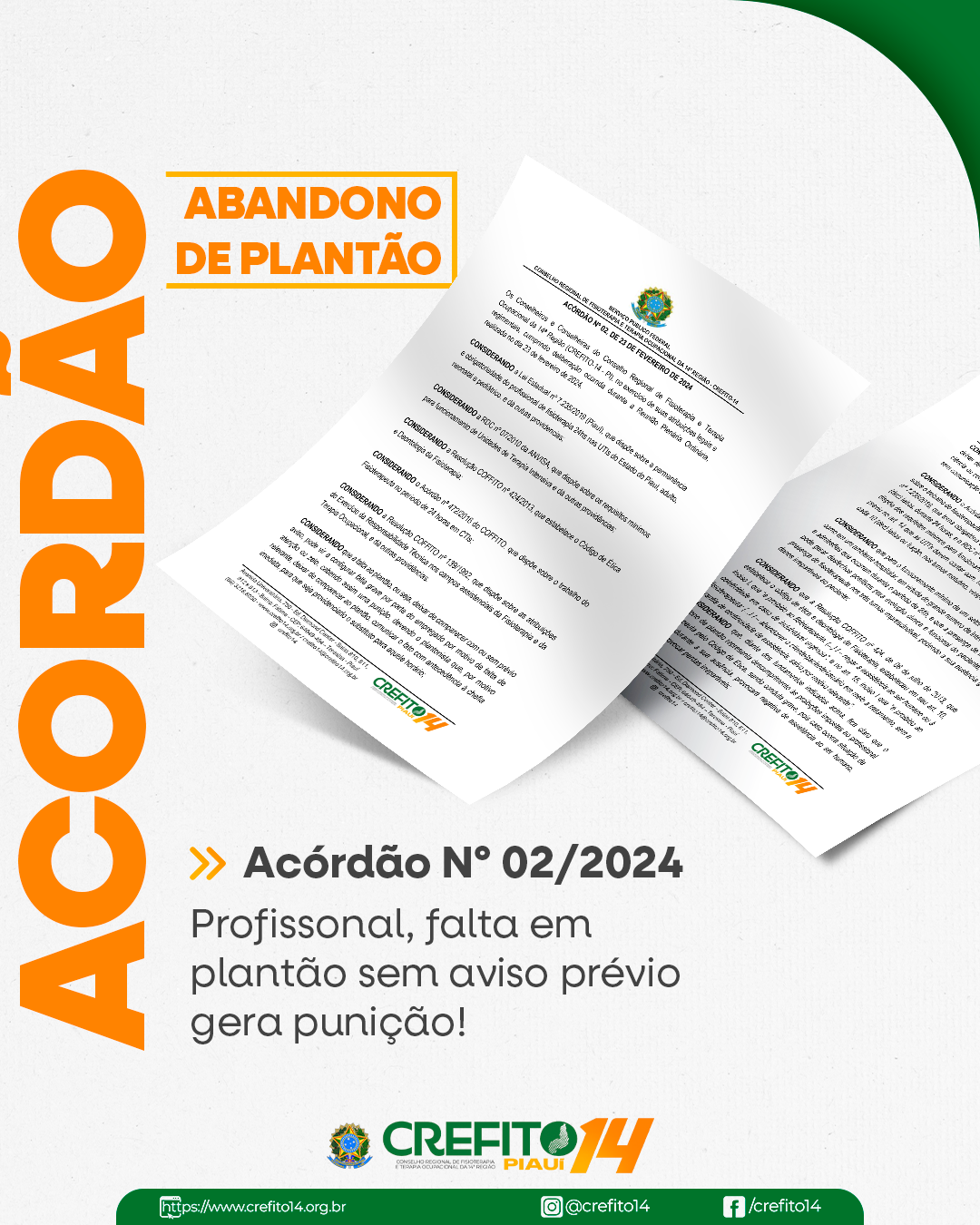 O Conselho Regional de Fisioterapia e Terapia Ocupacional da 14ª Região (CREFITO-14) tornou público recentemente o Acórdão N° 02/2024, que trata do abandono de plantão e possíveis punições para o profissional que pratica o ato.