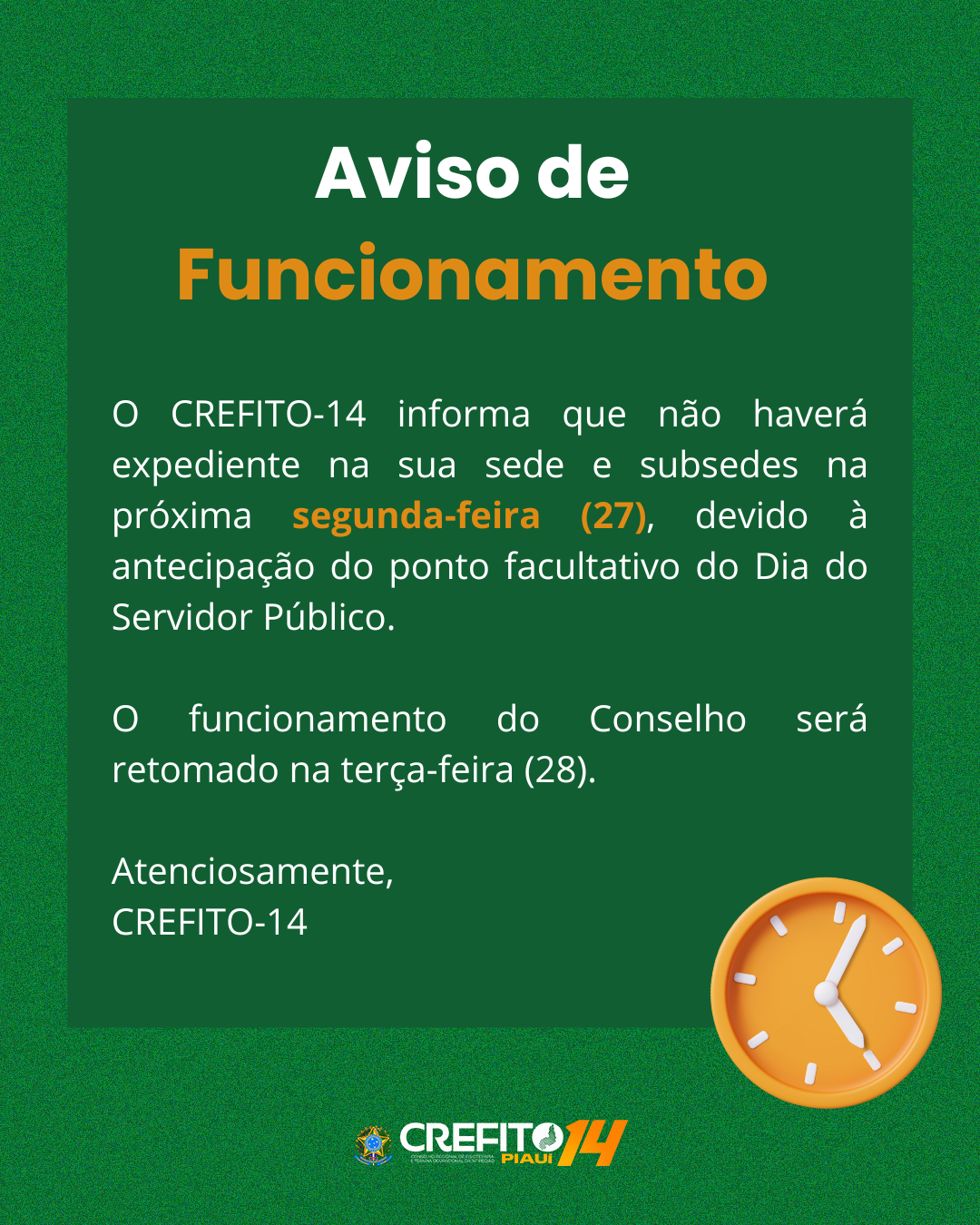 Com a intenção de promover o melhor aproveitamento das atividades administrativas, o CREFITO-14 informa que optou pela antecipação do ponto facultativo do Dia do Servidor Público. Dessa forma, não haverá expediente no dia 27 de outubro.