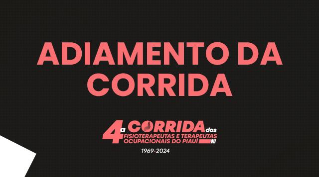 Prezados atletas, amigos, e apoiadores da 4° Corrida dos Fisioterapeutas e Terapeutas Ocupacionais do Piauí, em decorrência do recebimento de kits com material diferente do descrito no edital de licitação, e padrão de qualidade inferior ao oferecido aos corredores pela Xcrono, lamentamos informar o adiamento da corrida, originalmente marcada para o dia 13 de outubro de 2024.